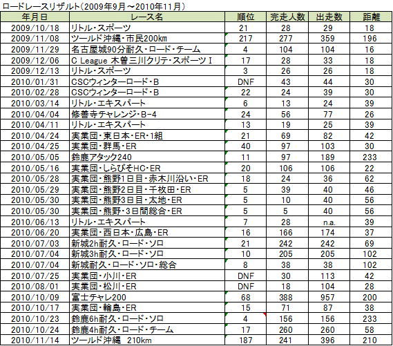 以降2010年11月まで実業団登録し各種レースに参戦(レースリザルトは下表ご参照)
